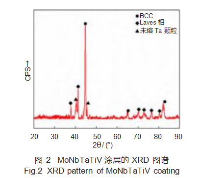 Figure 2 shows the XRD results for the MoNbTaTiV coating. The phase structure of high-entropy alloys is typically determined by calculating the sine values of each diffraction peak to distinguish between BCC and FCC structures [19]. The diffraction peaks at 2θ = 44.727°, 65.188°, 76.536°, and 89.864° in Figure 2 satisfy the proportional relationship sin2θ1:sin2θ2:sin2θ3:sin2θ4 = 2:4:6:8. Based on the crystal diffraction extinction principle, these peaks correspond to the BCC phase. Unmelted Ta particles are also present in the coating due to Ta's extremely high melting point, preventing complete melting by the laser energy during cladding. Additionally, a small amount of Laves phase (Fe₂Ti) formed in the coating, consistent with the aforementioned calculation results.