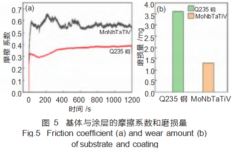(2) The average coating hardness reached 756.7 HV0.2, four times that of the substrate. The coating friction coefficient was slightly higher than the substrate, but wear volume was significantly reduced, demonstrating superior wear resistance compared to the Q235 steel substrate.