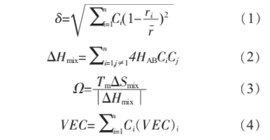 In physical metallurgy, the Hume-Rothery criterion is primarily used to investigate the effects and patterns of displacement solid solutions in binary alloys. Zhang et al. [15] extended the Hume-Rothery criterion to high-entropy alloys, proposing several key parameters to determine whether a single solid solution phase forms. The atomic size difference δ, mixing enthalpy ΔHmix, and Ω are calculated using Equations (1), (2), and (3), respectively. Empirical data indicate that a single solid solution phase is more likely to form when the mixing enthalpy ΔHmix falls within -15 to 5 kJ/mol, Ω > 1.1, and δ < 6.6%. Guo et al. [16] proposed that the crystal structure of solid solutions can be determined by the valence electron concentration (VEC). Equation (4) calculates the system's VEC, indicating that BCC solid solution phases are relatively stable when VEC ≤ 6.87.