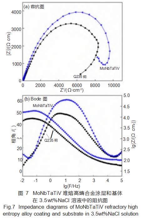 Further electrochemical impedance spectroscopy (EIS) studies were conducted on the coating and substrate. Figure 7 shows the EIS results for the MoNbTaTiV refractory high-entropy alloy coating and substrate in a 3.5 wt% NaCl solution.