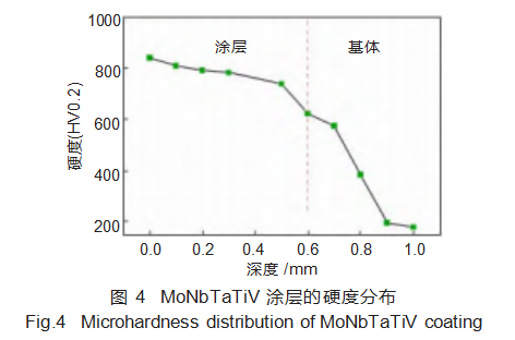 Figure 4 shows the hardness distribution curve of the laser-clad MoNbTaTiV refractory high-entropy alloy coating. The coating exhibits an average hardness of 756.7 HV0.2, which is four times that of the substrate (189 HV0.2) and significantly higher than the base material.