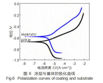 Figure 6 shows the dynamic potential polarization curves of the MoNbTaTiV refractory high-entropy alloy coating and substrate in a 3.5 wt% NaCl solution. During electrochemical testing, Cl⁻ readily reacts with metallic elements in the coating, forming a corrosion product film that penetrates the coating surface and affects material corrosion resistance [20]. It can be observed that the MoNbTaTiV refractory high-entropy alloy coating exhibits a narrow passivation region, indicating the formation of a passivation film. Corrosion continues once this passivation film is breached by Cl⁻. This occurs because Ta, Mo, and Ti in the MoNbTaTiV refractory high-entropy alloy coating exhibit strong corrosion resistance. During electrochemical testing, a passivation layer forms, thereby inhibiting further corrosion.