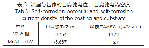 Table 3 presents the self-corrosion potential (Ecorr) and self-corrosion current density (Jcorr) of the coating and substrate, calculated after Tafel fitting of the dynamic polarization curves. The results indicate that both the self-corrosion potential and self-corrosion current density of the MoNbTaTiV refractory high-entropy alloy coating are lower, demonstrating superior corrosion resistance and protective capability for the substrate.