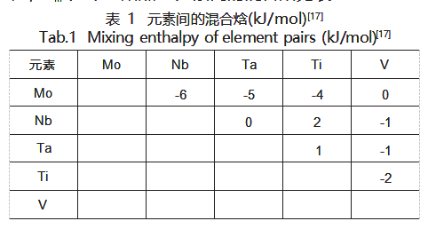 Where: HAB is the interatomic mixing enthalpy; Ci and Cj are the molar fractions of elements i and j, respectively; ri is the atomic radius of element i; r is the average atomic radius; Tm is the average melting point. Interatomic mixing enthalpies are listed in Table 1 [17].
