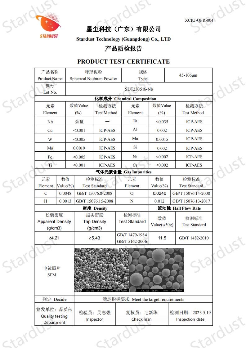 Purity: In the process of RF plasma spheroidization preparation, the introduction of impurities is effectively reduced, the purity is high, and the content of impurity elements (such as oxygen, carbon, nitrogen, etc.) is low, which ensures the quality and performance stability of niobium powder.